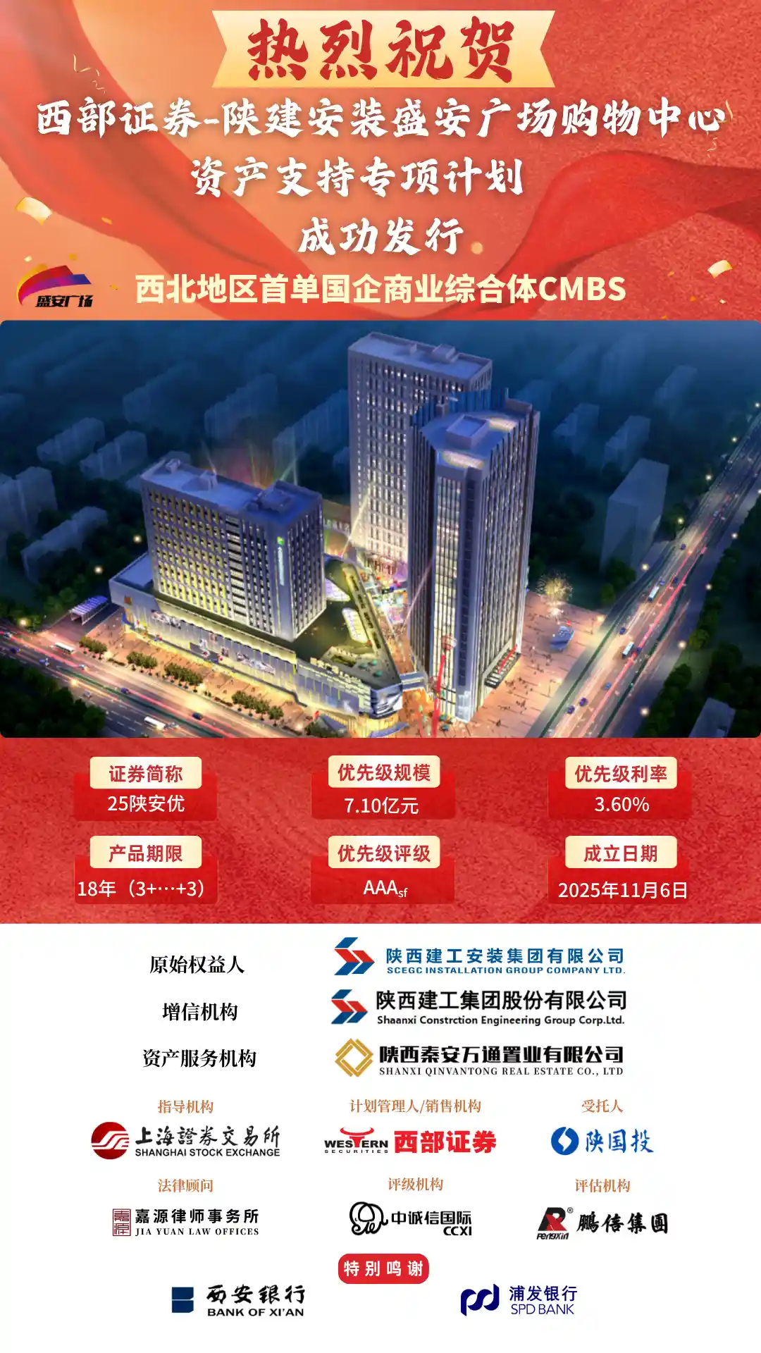 11月6日,在上海证券交易所指导下,由西部证券担任计划管理人及销售机构的“西部证券—陕建安装盛安广场购物中心资产支持专项计划(CMBS)”成功发行,发行规模7.11亿元,期限18年,评级AAAsf,票面利率3.6%。本次CMBS由中国企业500强第120位的陕西建工集团股份有限公司(600428.SH)提供外部增信,是西北地区首单国企商业综合体消费基础设施资产证券化产品。