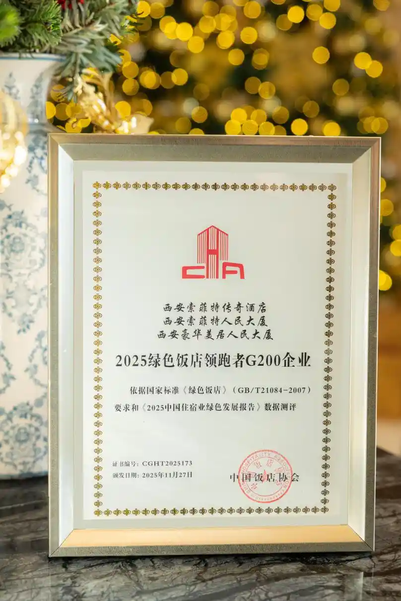 近日,西安人民大厦索菲特传奇酒店、索菲特酒店、豪华美居酒店共同斩获“2025绿色饭店领跑者G200企业”荣誉,以扎实的绿色运营成效领跑行业。