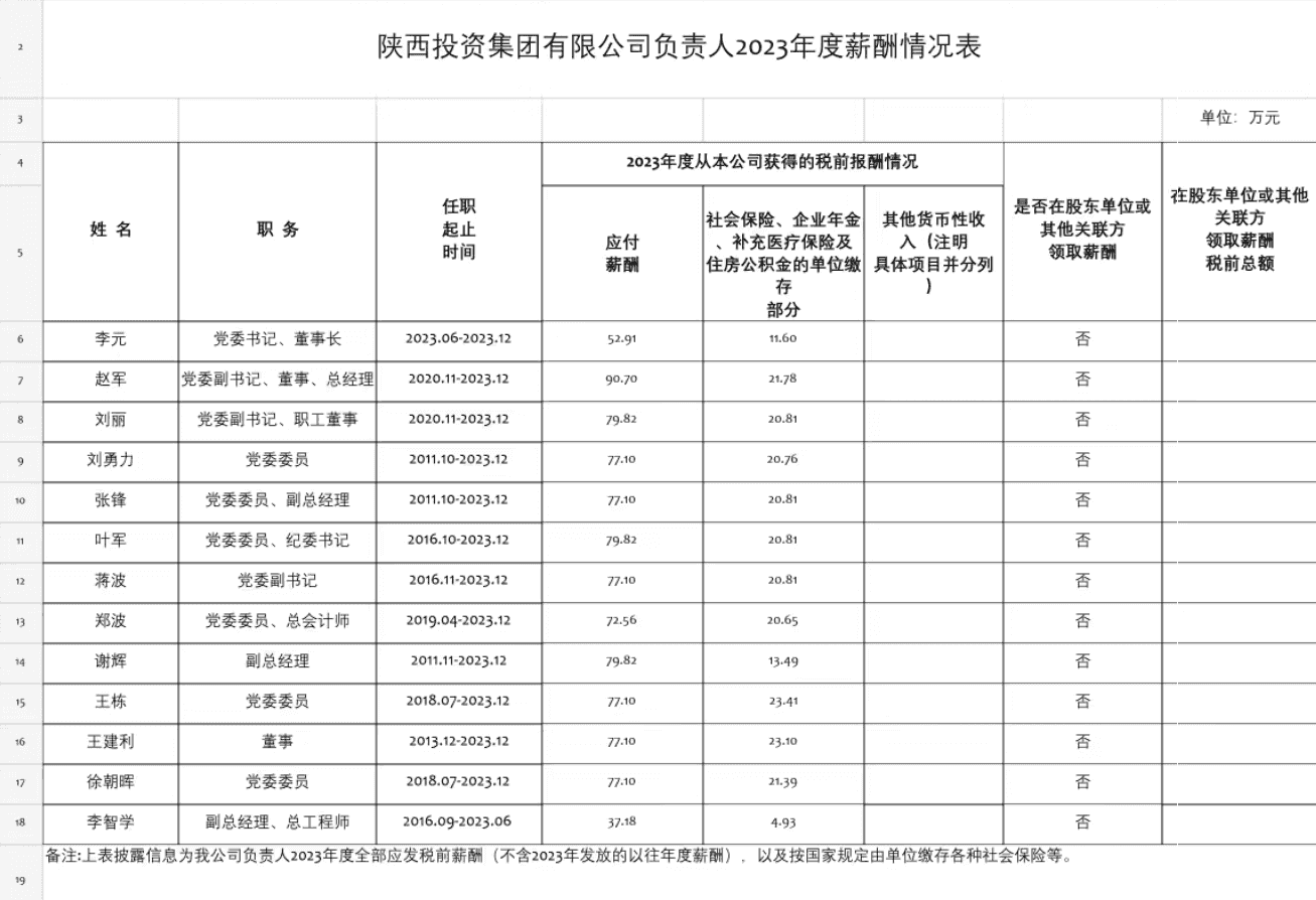陕西投资集团有限公司负责人2023年度薪酬情况表